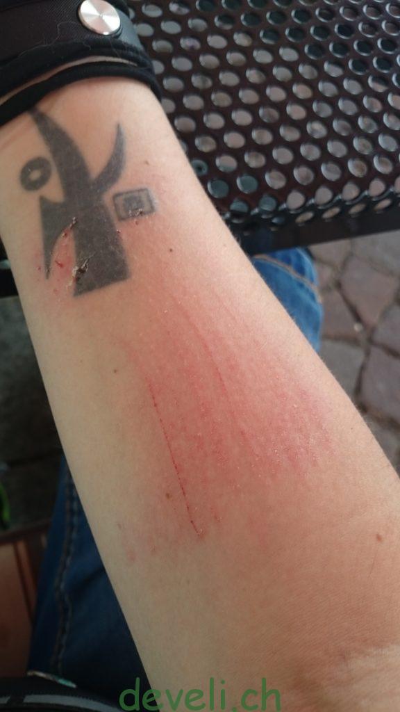 5min nach Hause laufen, plötschen bei jedem Schritt und zag, ivi hat ne Beule am Bein die total Aua macht.